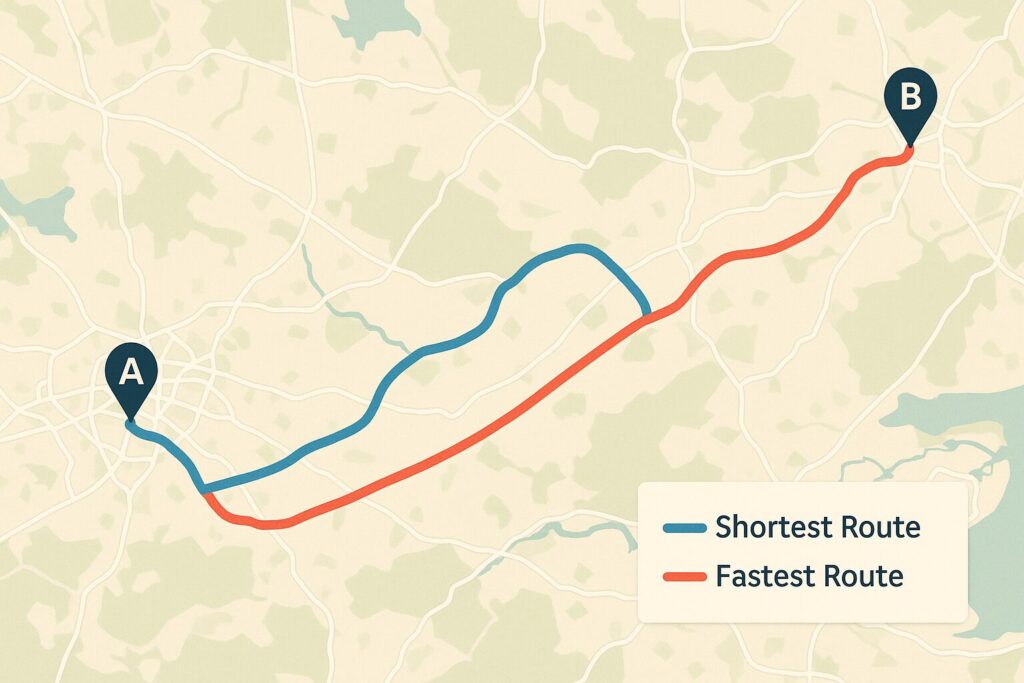 Think about driving around a major city. The “shortest” way might be straight through downtown on local streets. But if it’s anywhere near rush hour (or even midday), the “fastest” way is almost certainly going to be taking the longer beltway or bypass highway around the congestion, even if it adds 15 miles to the trip odometer.
